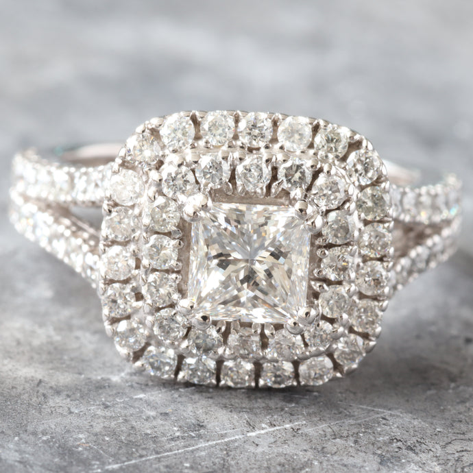 2.00CTW Princess Cut Diamond with Double Cushion Halo and Split Pave Shoulders Ring