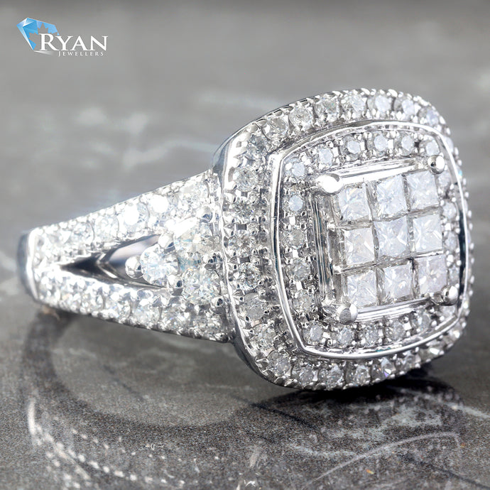 RING GW 14KT 2.00CTW PRINCESS INVISABLE SET CENTER TWO TIERED CUSHION HALO WITH SPLIT DIAMOND SHOULDERS