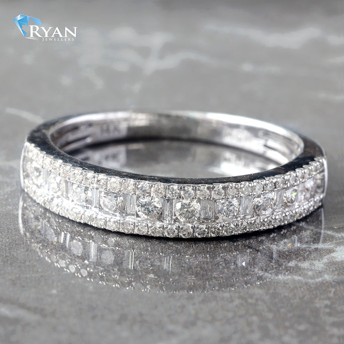 RING GW 14K 0.50CTW THREE ROW BAND WITH ALTERNATING ROUND AND BAGUETTE CENTER
