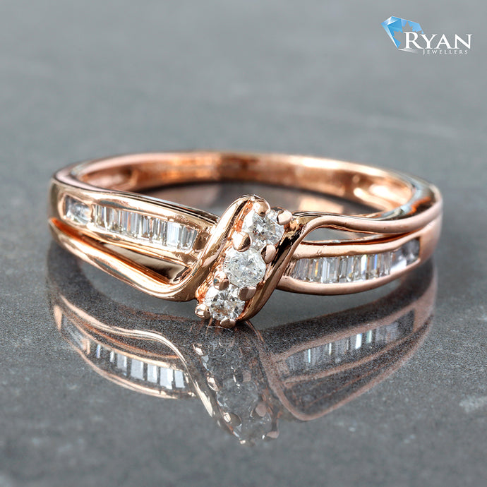RING GR 10K 0.15CTW DIAMOND THREE STONE BAGUETTE CHANNEL CROSS OVER DESIGN