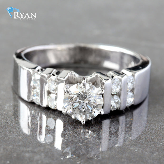 RING GW 18K 0.88CTW ROUND 6 PRONG SOLITAIRE SECTIONAL CHANNEL SET SHOULDERS