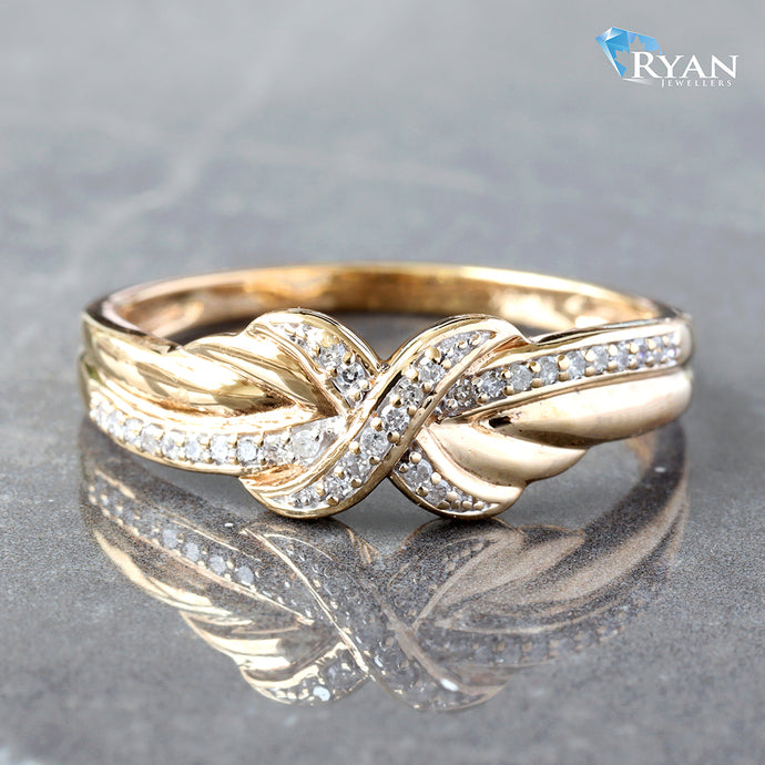 RING GY 0.08CTW NATURAL DIAMOND X CENTER WITH PAVE CROSS OVER HP SHOULDERS