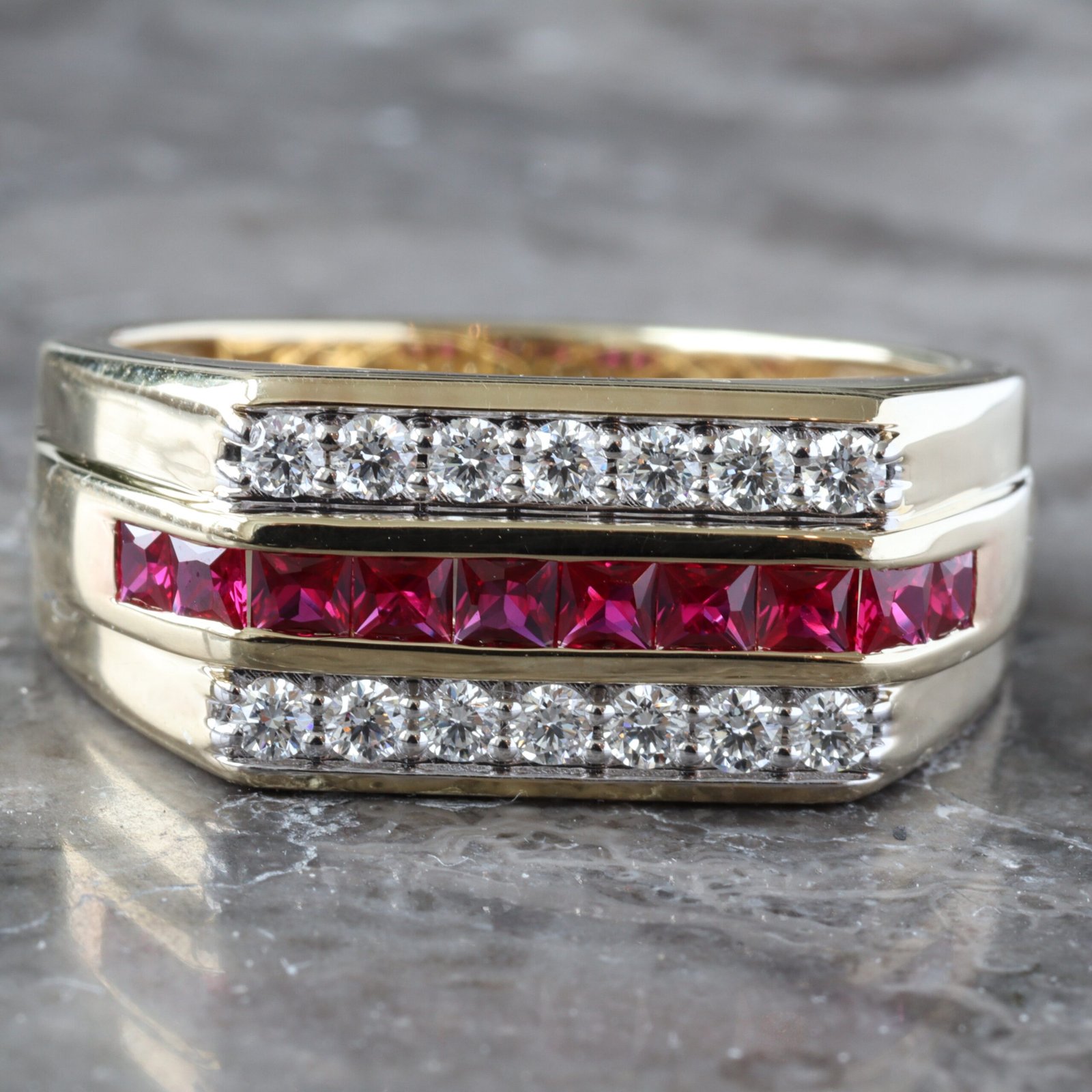 0.40ctw Three Row Table Top with Channel Set Princess Cut Ruby Center and Two Row Lab Diamonds