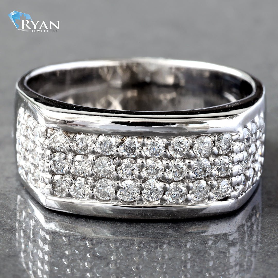 Three Rows of round brilliant prong set earth mined diamonds across a rectangle forefront totaling 0.75 carats.