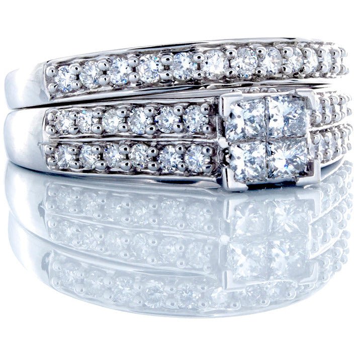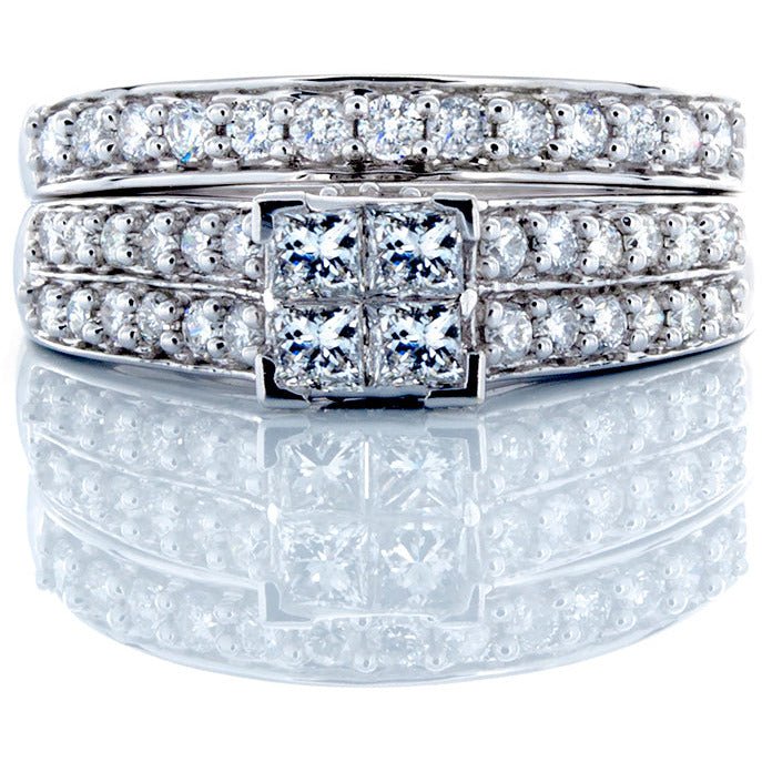 0.80CTW Natural Princess Quad Center With 2 Row Pave Shoulders & Matching Wedding Band 14k White Gold