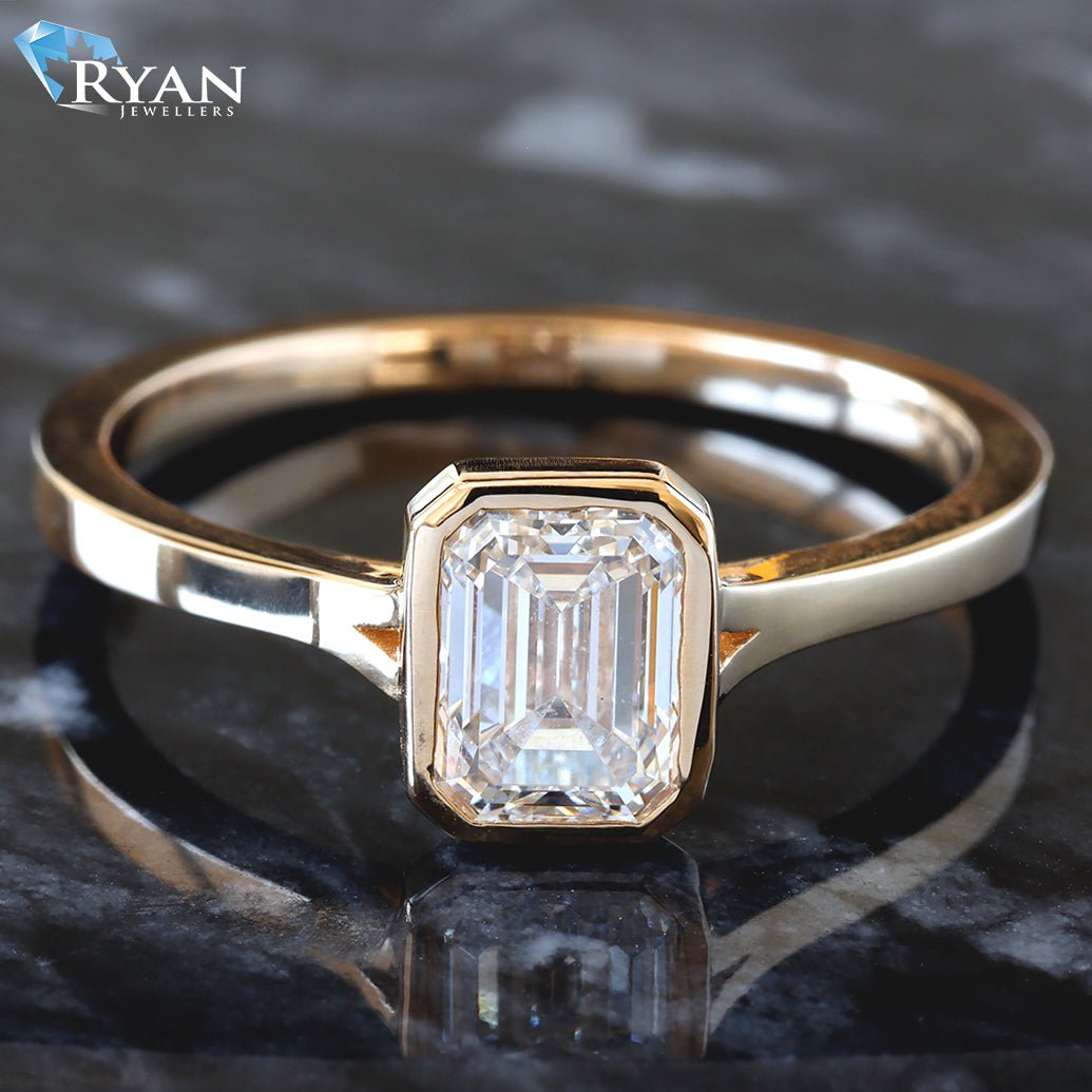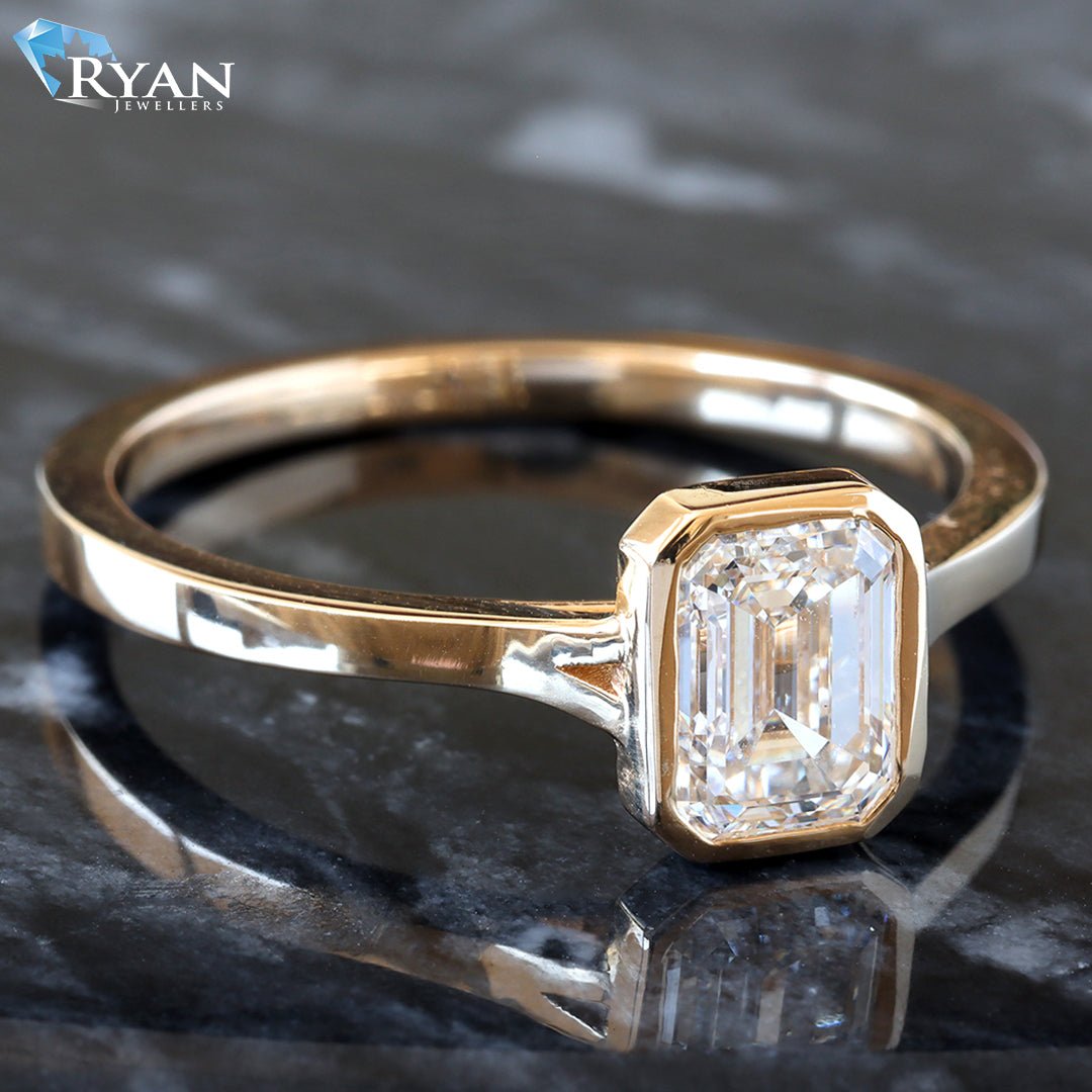1.00ct Bezel Set Emerald Solitaire Slight Split Square Edge Shoulders Ring