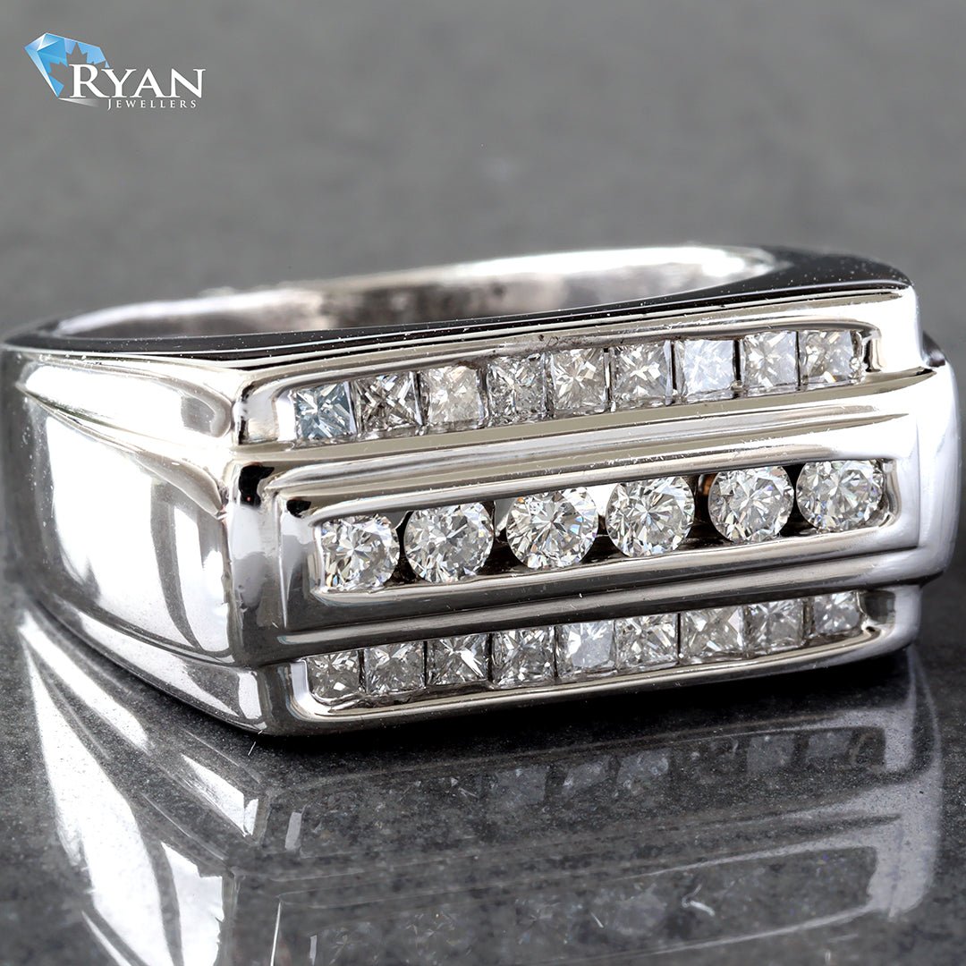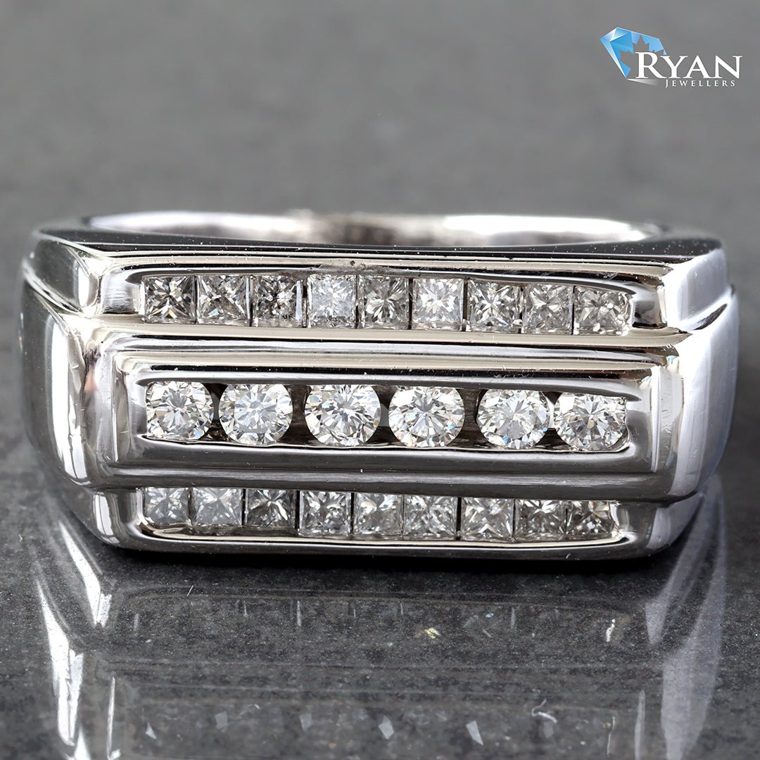 Alternating Three Row Channel Set Princess & Round Brilliant Cut Earth Mined Diamonds Rectangle Table Top Ring with Raised Center 14K White Gold