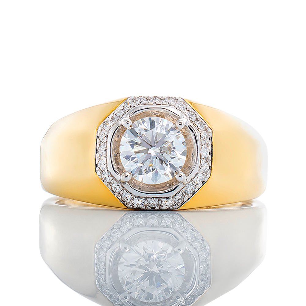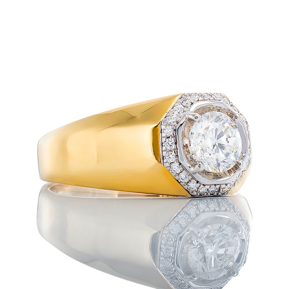 LAB Created Round Diamond Center With Octagon Pave Boarder and Yellow Gold High Polish Shoulders