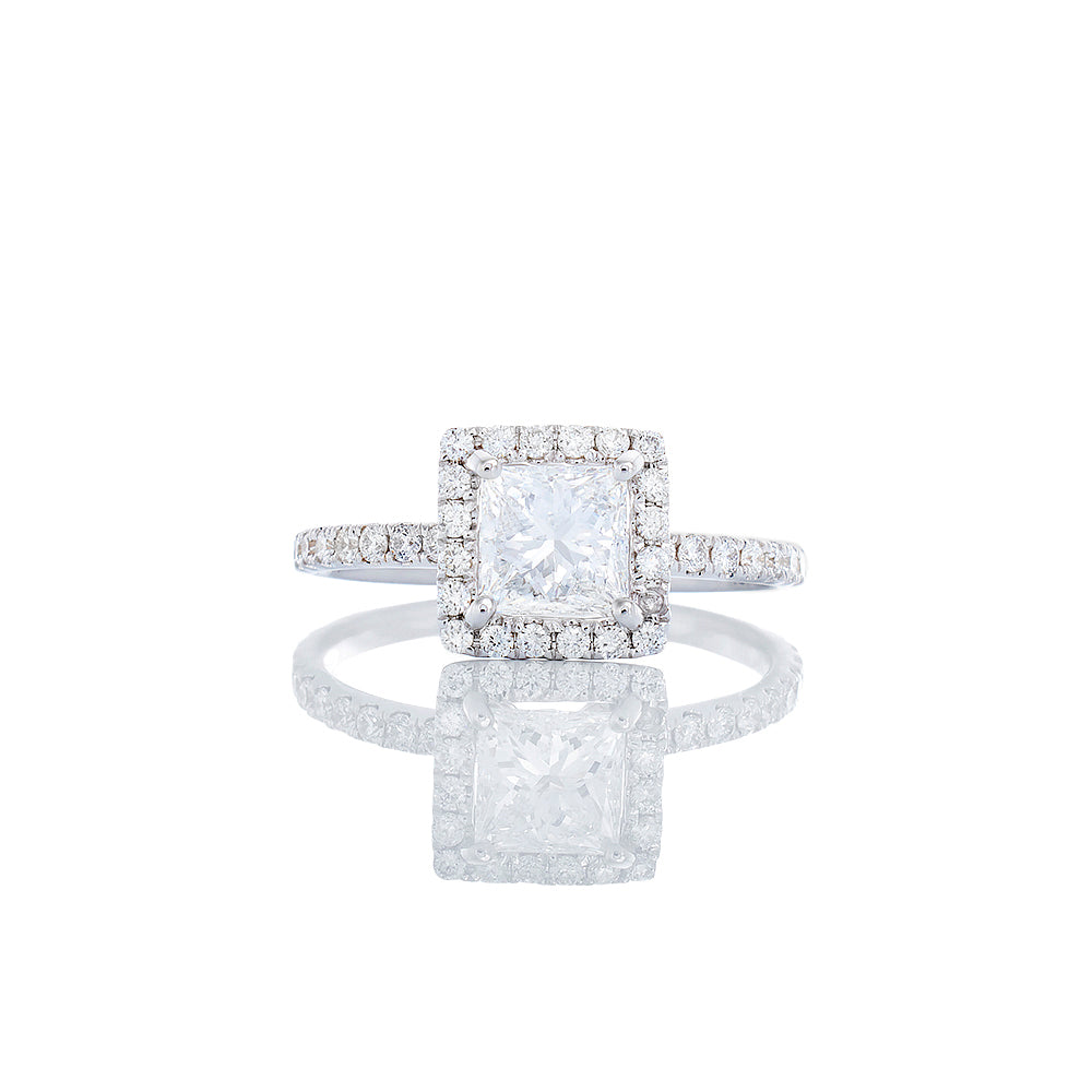 1.15ctw Princess Cut Solitaire Square Halo & Diamond Pave Shoulders 18k White Gold
