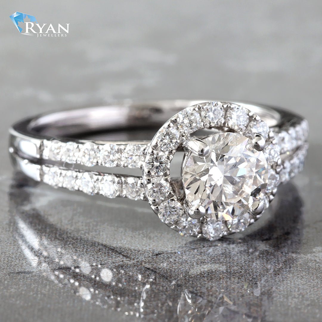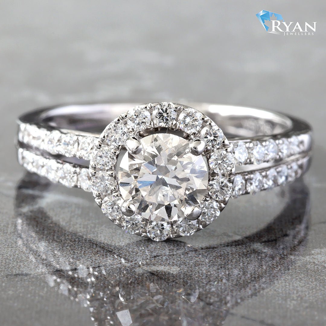- Round Cut Halo and Split Shoulders