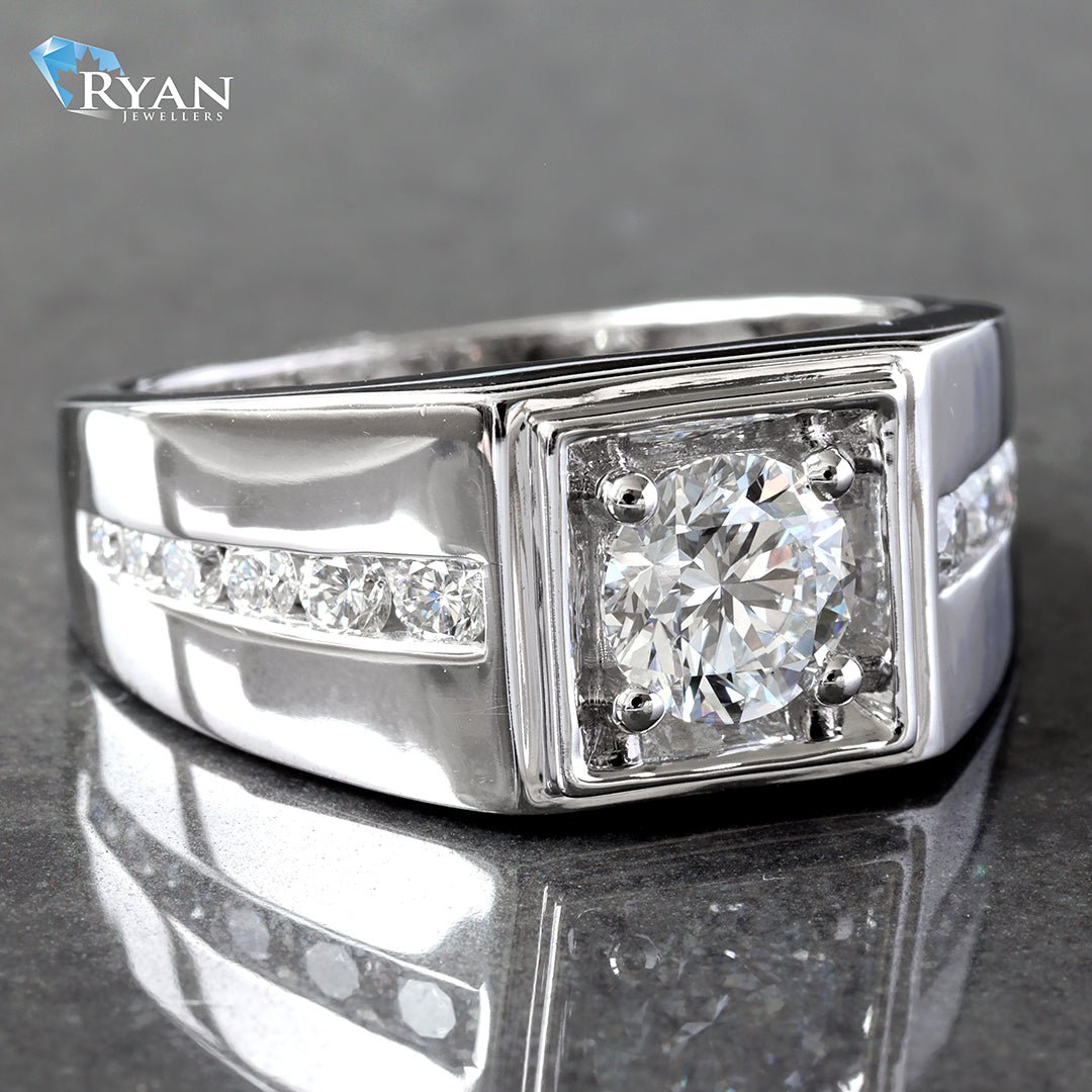 Men’s diamond ring featuring one round brilliant cut four prong set solitaire lab created diamond in the center with channel set diamonds on the high polished shoulders.