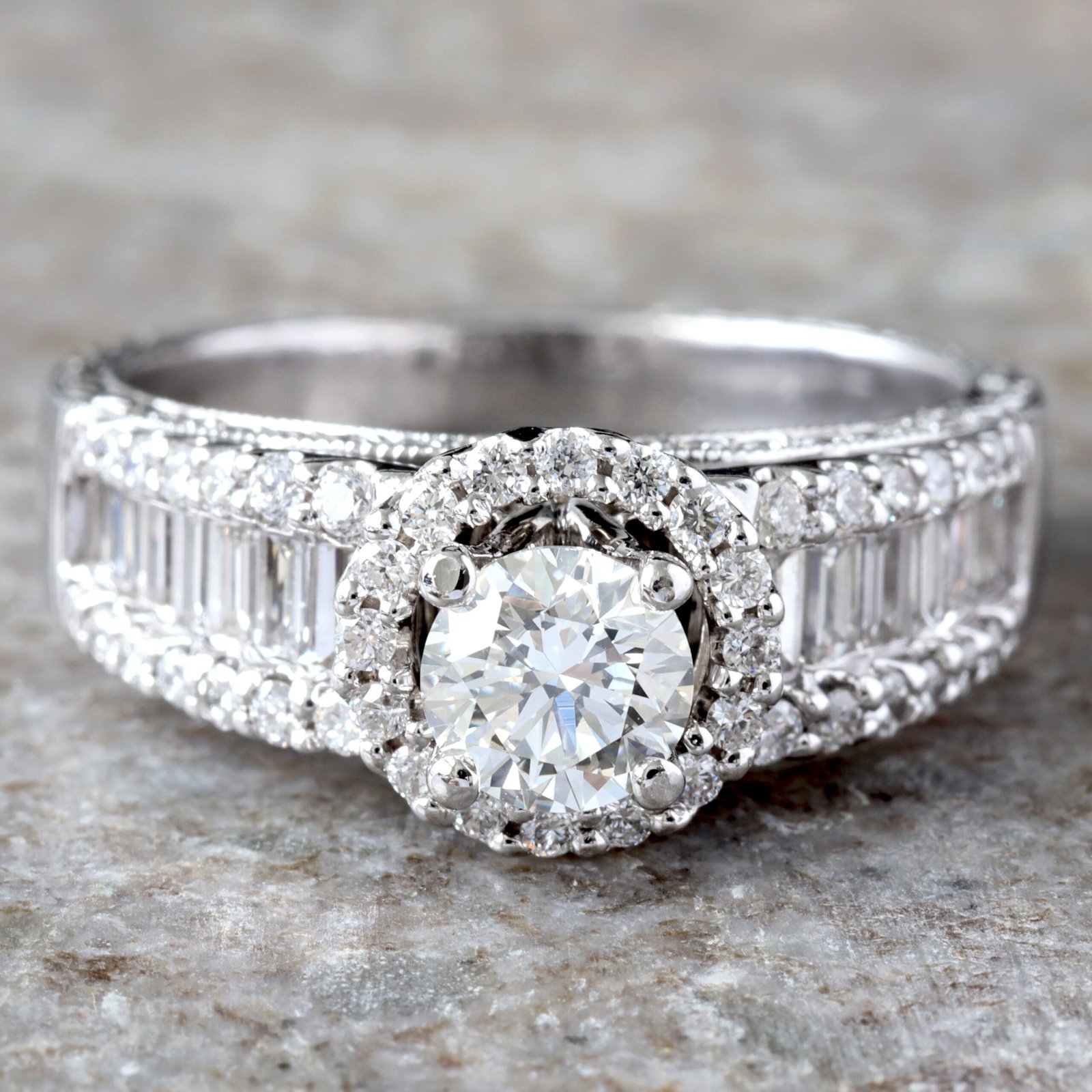1.70CTW Natural Round Diamond With Halo and Baguette & Round Shoulders w/ Diamond Set Sides
