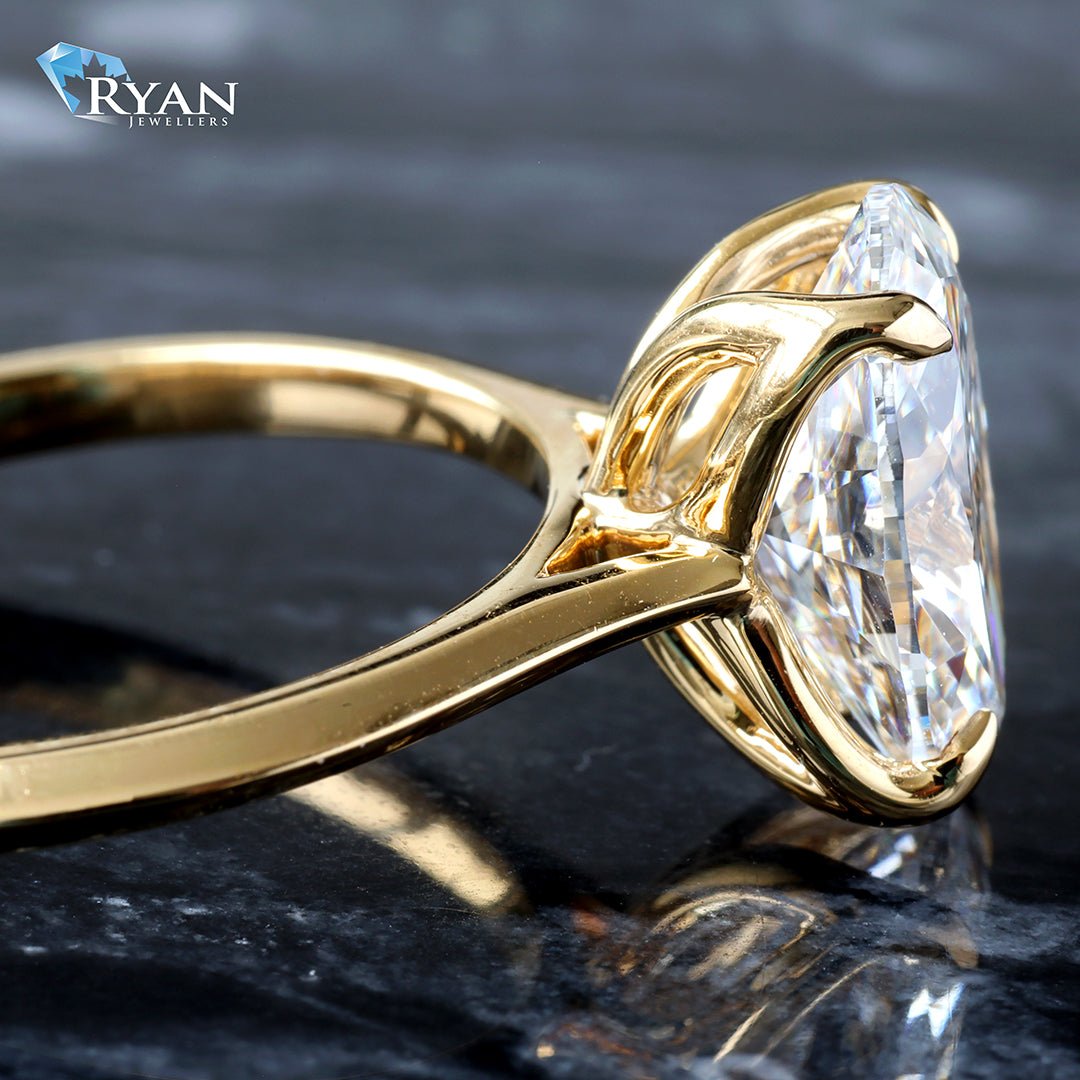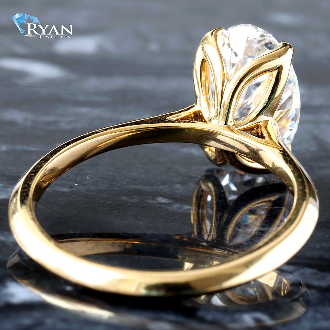 - Created Oval Solitaire Cut Diamond Center totalling 2.51ct with a classic high polished yellow gold mount 14kt featuring one yellow gold floral basket.