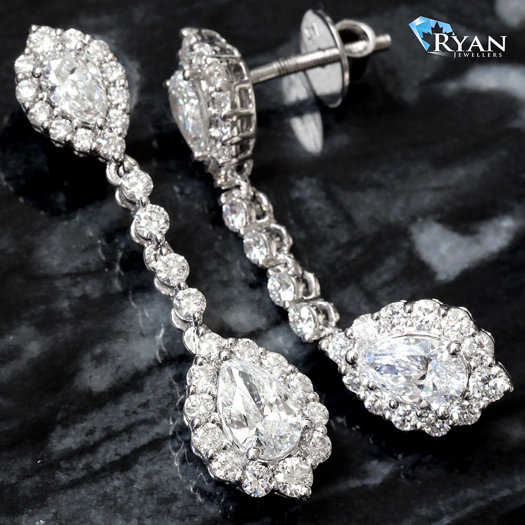 Elegant Dangling Drop Studs Featuring 4 Pear Cut Solitaires Surrounded with Round Cut Diamonds in a Halo Design, Secured with Screw Backings for Closure.