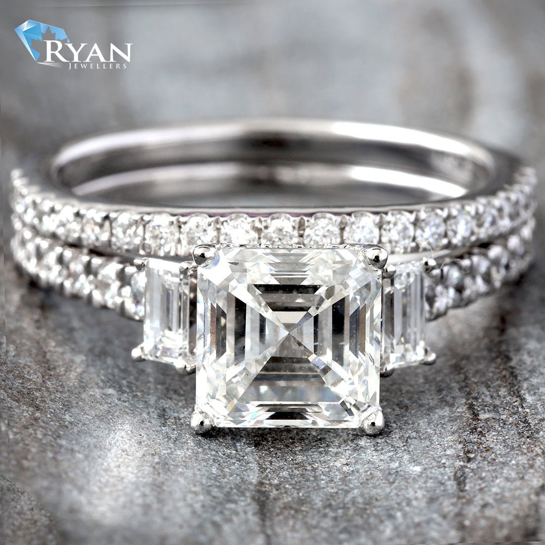 2.75ctw Bridal Set Ascher Cut with Baguette Sides and Pave Shoulders Rind and Matching Band