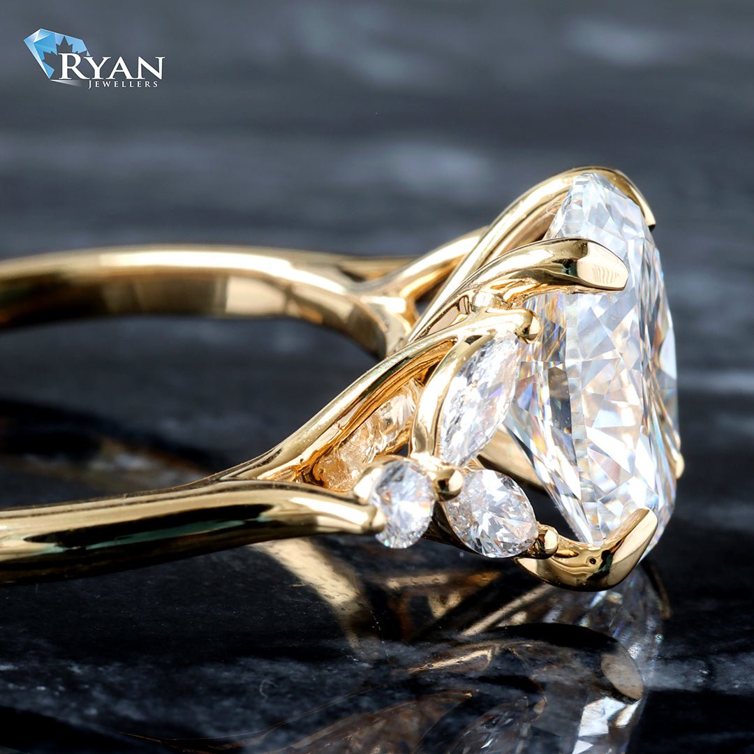 - Lab Created Oval Solitaire totalling 2.51ct with high polished yellow gold mount 14kt featuring 0.30ct marquise and round floral design shoulders.