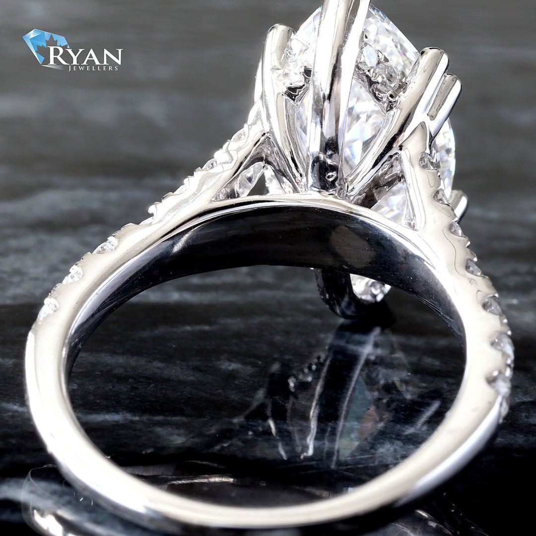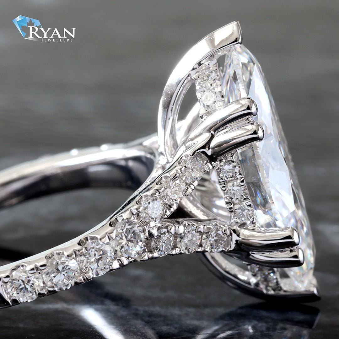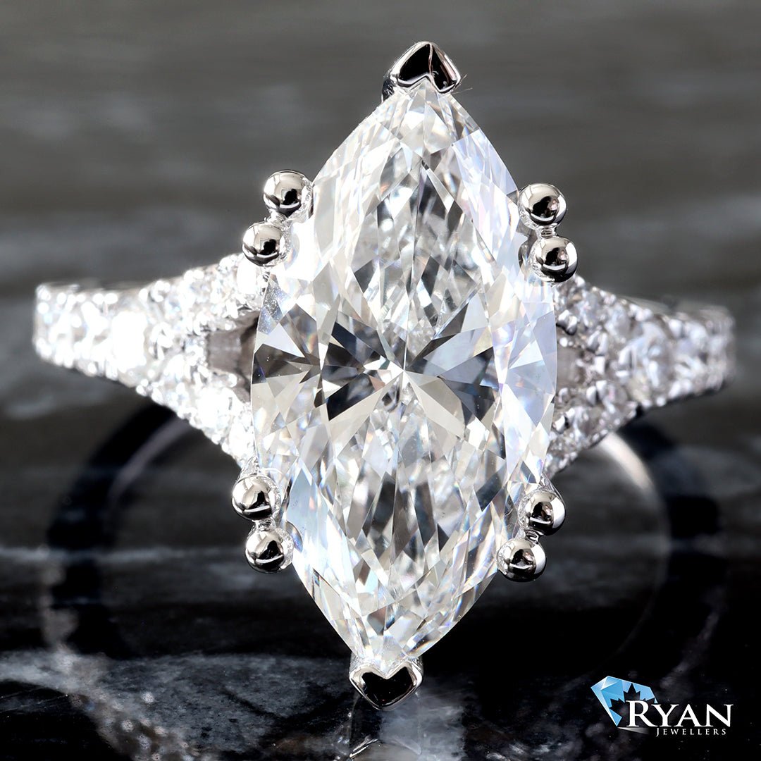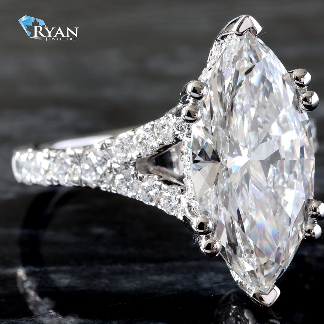 Lab Created marquise solitaire with hidden halo & split pave set diamond shoulders ring totaling 4.75 carats.
