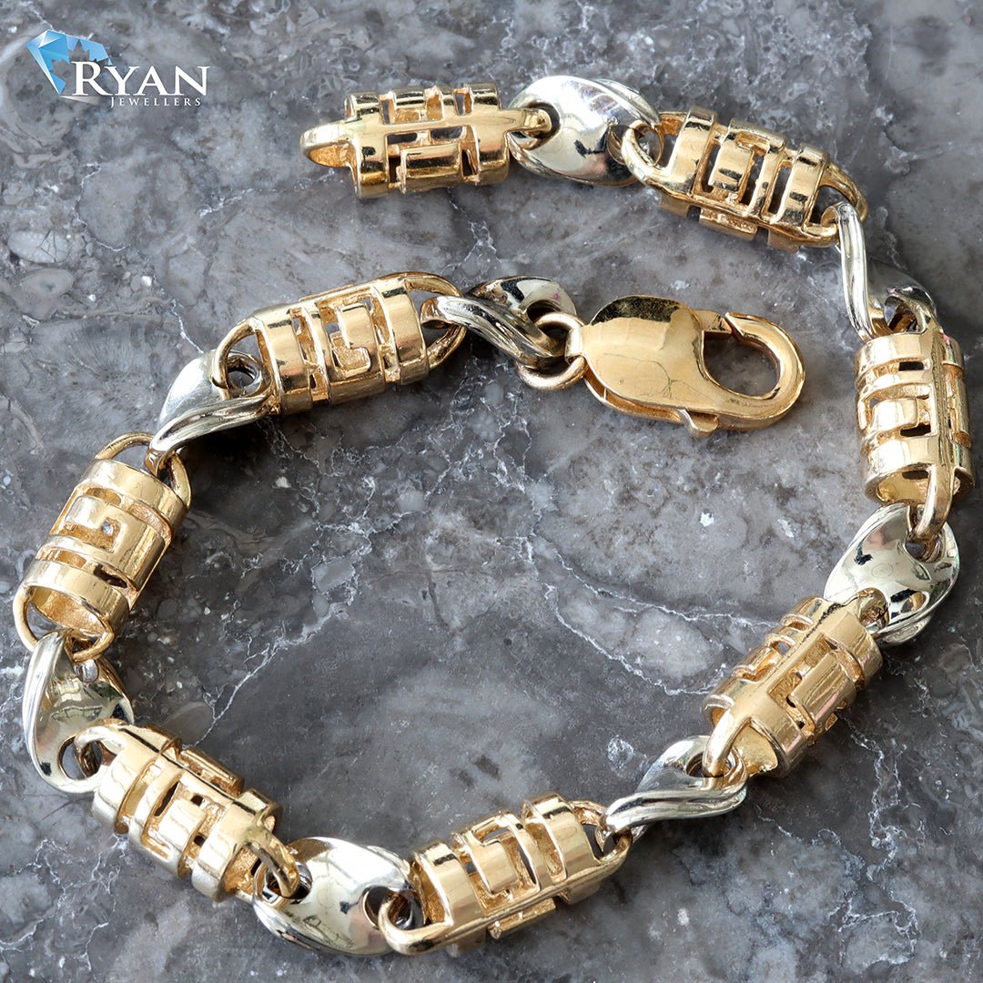 Solid Two Tone Casting Bracelet Featuring Alternating Yellow Gold Greek Key Bullet Links & White Gold Twisted Gucci Puff Links Using One Classic Lobster Clasp For Closure.