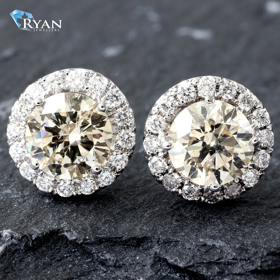 EARRING GW 18K 2.55CTW ROUND BRILLIANT SOLITAIRE WITH DIAMOND HALO STUDS
