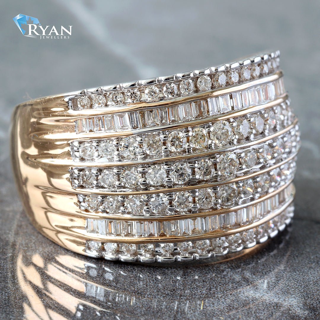 RING GY 10K 1.00CTW ROUND AND BAGUETTE SEVEN ROW DIAMOND DOME BAND
