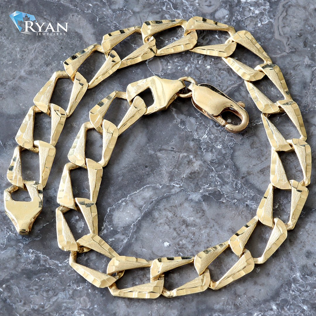 Locally Made Soft Square Edge Casting Link Bracelet Featuring Sand Blast Center With Diamond Cut Border And Classic Lobster Clasp For Closure.