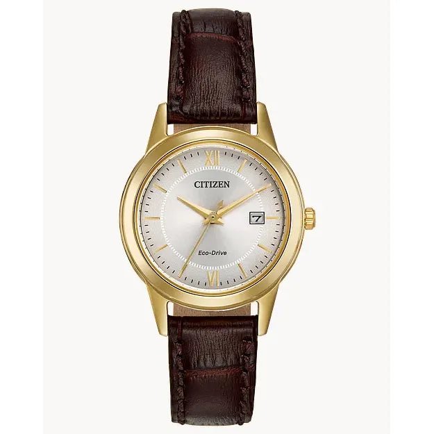 A classic design, rich brown leather strap, and date are features of this traditional dress timepiece from CITIZEN®’s Corso collection. Shown with a gold-tone stainless steel case and a metallic silver-tone dial enhanced with gold-tone accents.