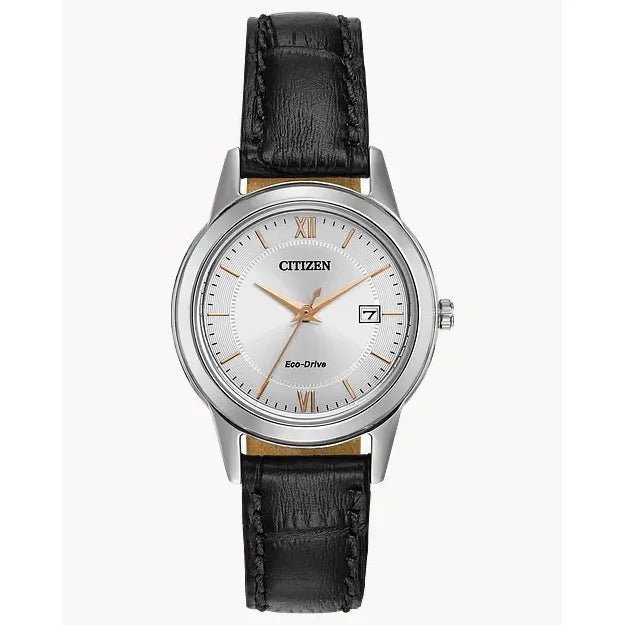 A classic design, rich brown leather strap, and date are features of this traditional dress timepiece from CITIZEN®’s Corso collection. Shown with a stainless steel case and a metallic silver-tone dial enhanced with rose gold-tone accents.