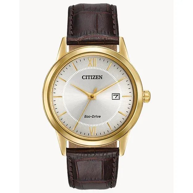 A classic design, rich brown leather strap, and date are features of this traditional dress timepiece from CITIZEN®’s Corso collection. Shown with a gold-tone stainless steel case and a metallic silver-tone dial enhanced with gold-tone accents.