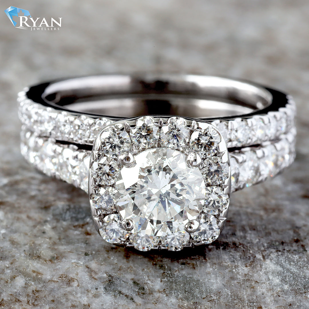 2.51CTW Natural Round Diamond Center with Cushion Halo and Pave Shoulders Bridal Set