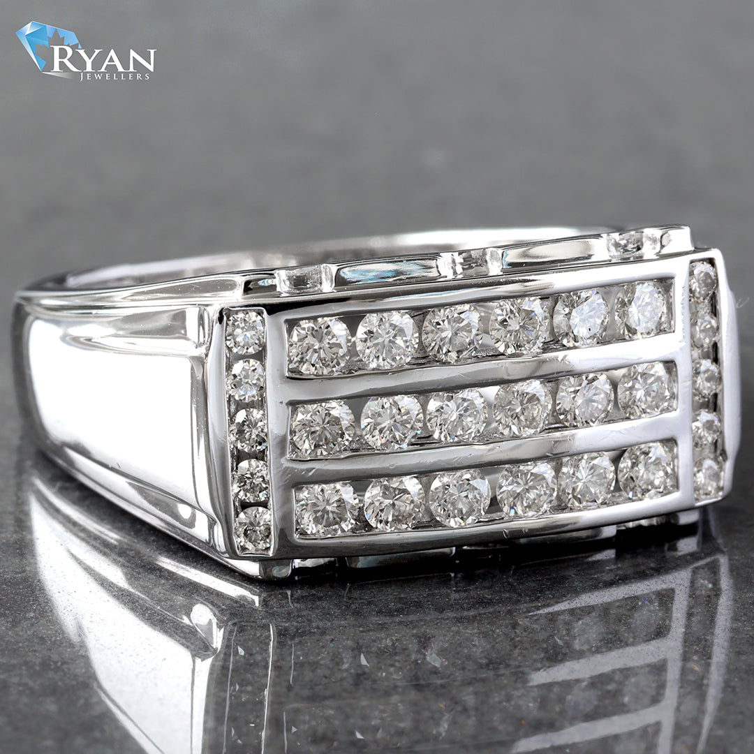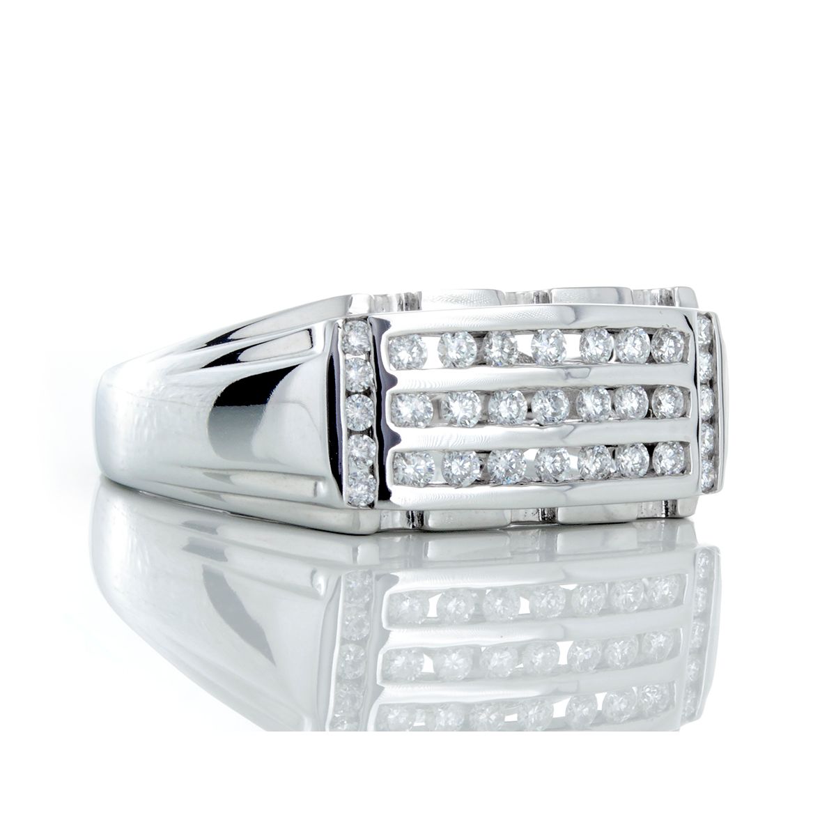 Mens rectangle earth mined diamond ring featuring round brilliant cut three row horizontal channel set center with vertical channel set diamond edges totalling 1.00ctw