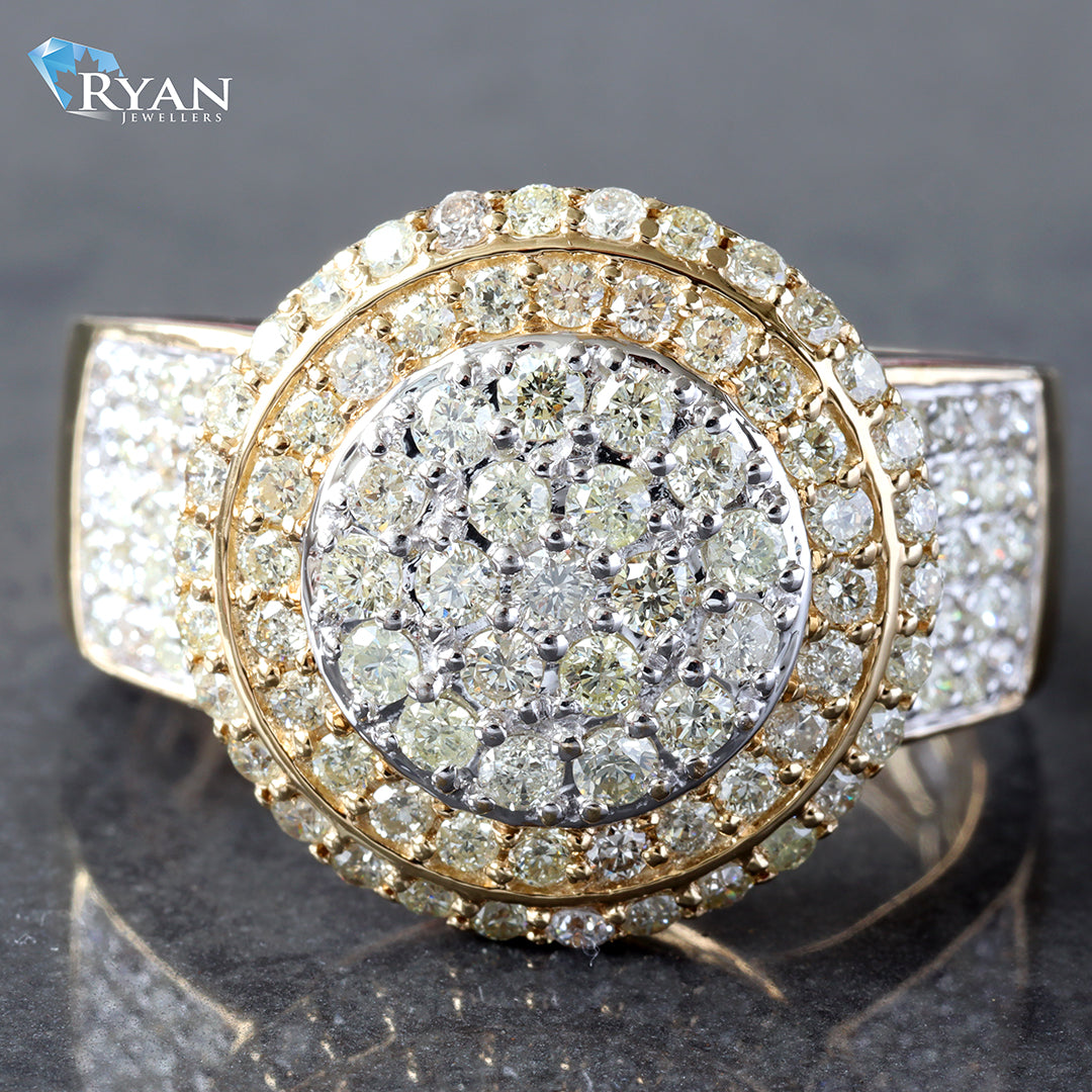 RING GY 10K 1.50CTW ROUND CLUSTER THREE TIERED LOW PROFILE LOLLIPOP RING FOUR ROW PAVE SHOULDERS