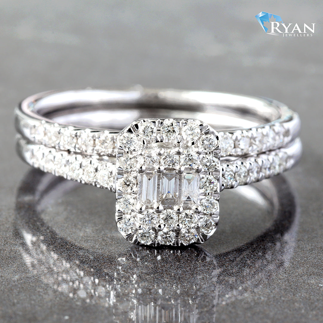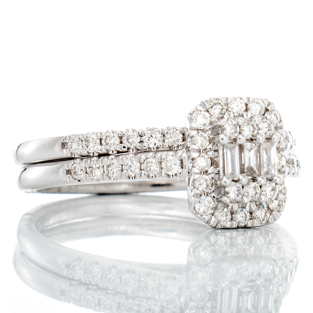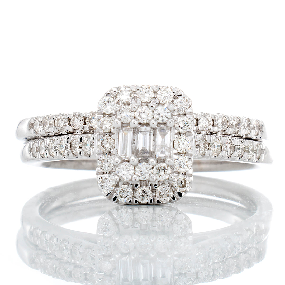 RING GW 14K 0.50CTW DIAMOND BAGUETTE AND ROUND EMERALD SHAPE HALO PAVE SHOULDERS BRIDAL SET