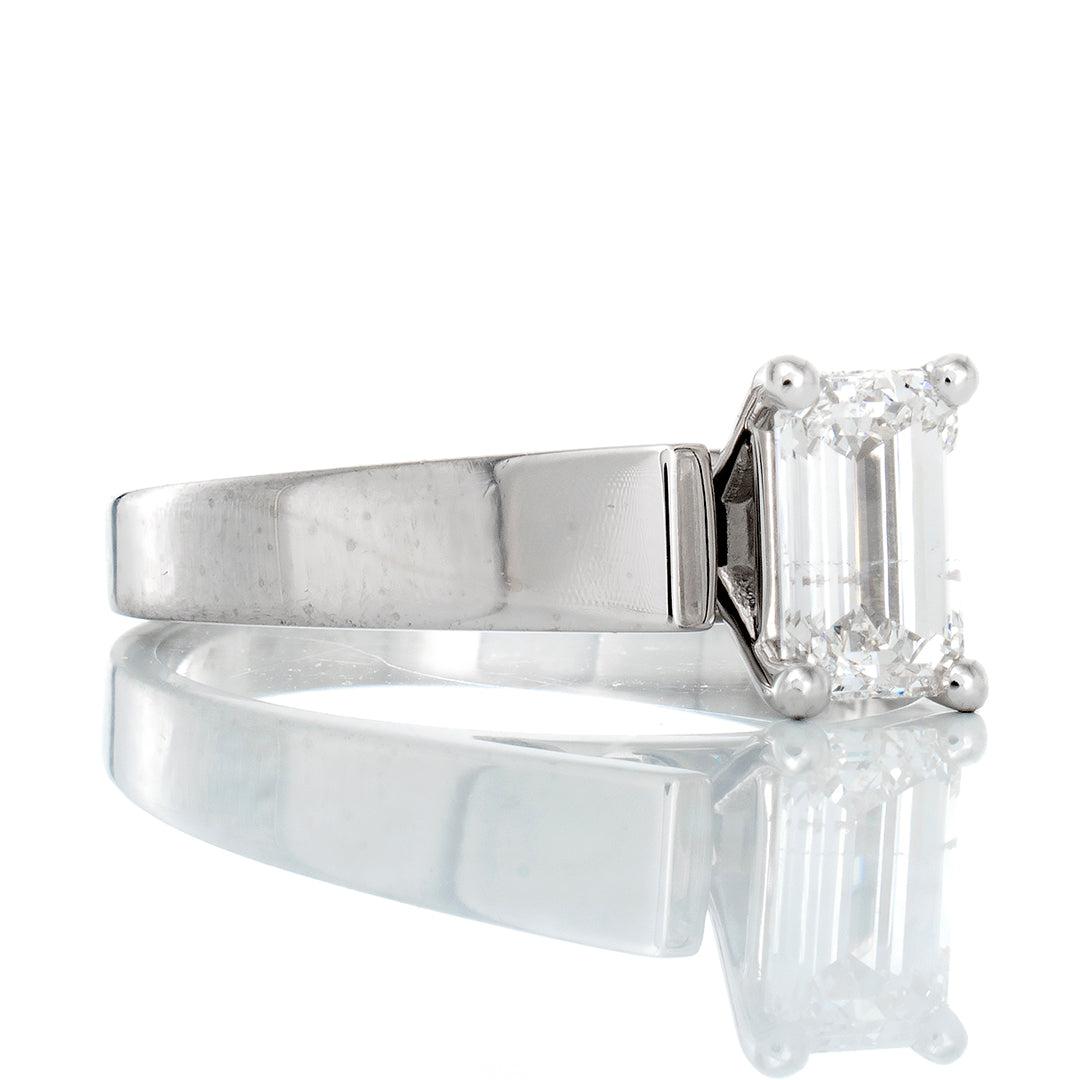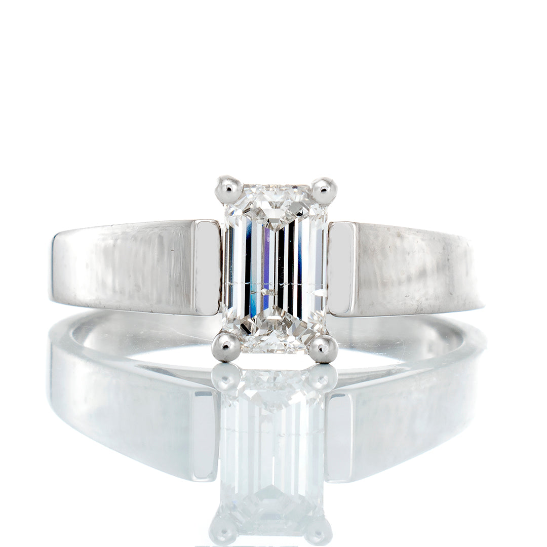 RING GW 14KT 0.65CT EMERALD CUT SOLITAIRE HP UPSWEPT FLAT EDGE SHOULDERS