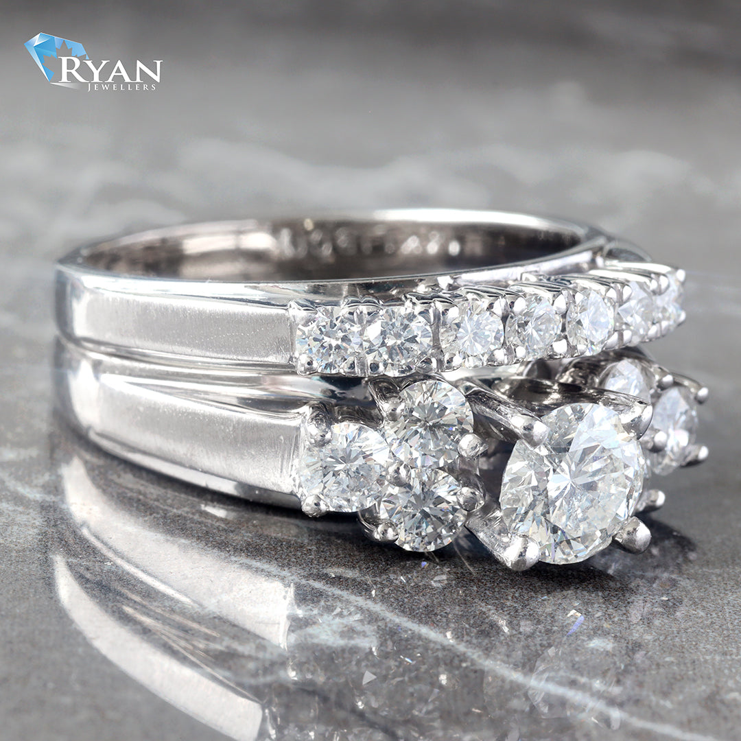 RING GW 14K 1.80CTW ROUND SOLITAIRE THREE DIAMOND CLUSTER SHOULDERS WITH MATCHING PRONG SET BAND