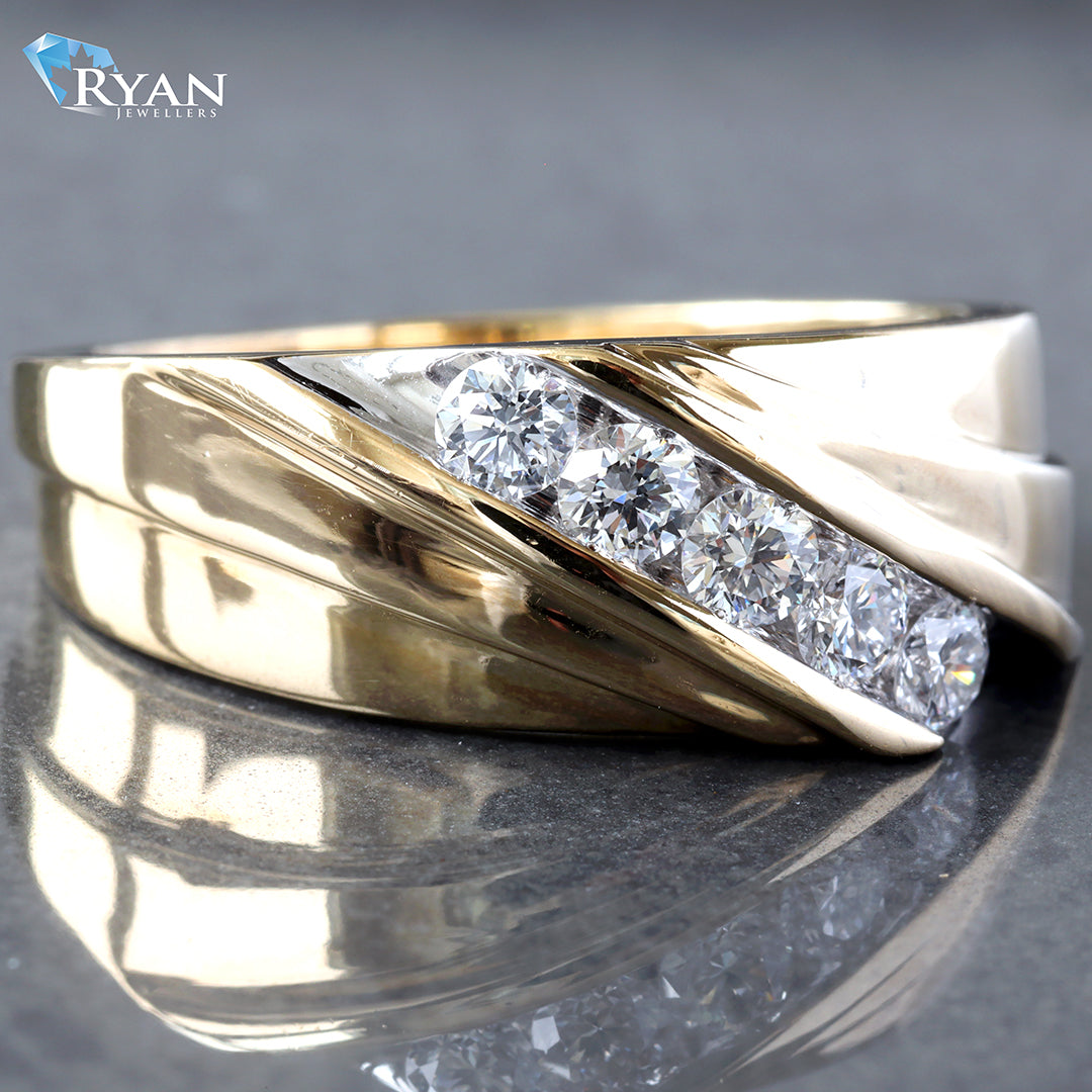 Lab Created Men's Diamond Band Featuring Five (5) Round Cut Diagonal Channel Set Diamonds Across The Forefront with High Polished Wave Finishing.