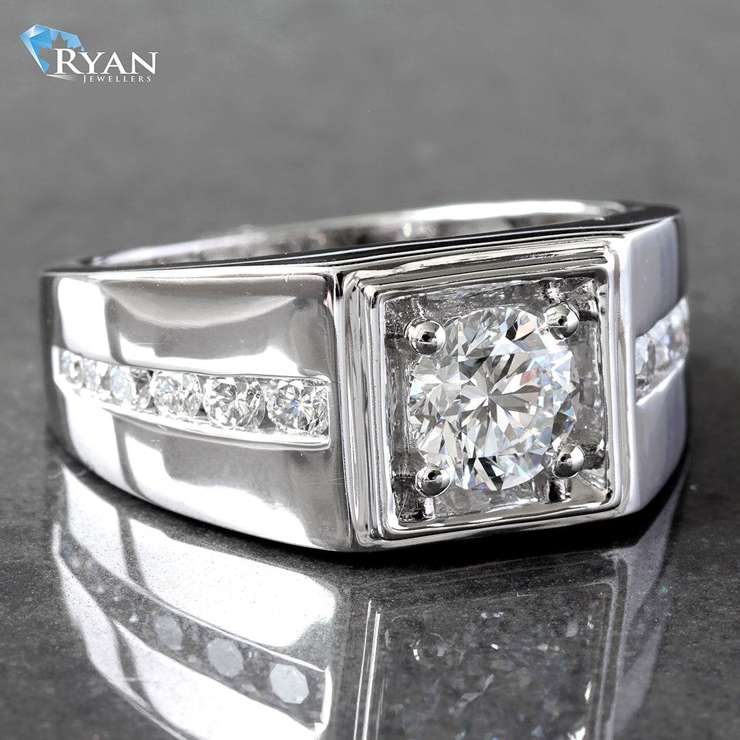 Men's diamond ring featuring one round brilliant cut four prong set solitaire lab created diamond in the center with channel set diamonds on the high polished shoulders.