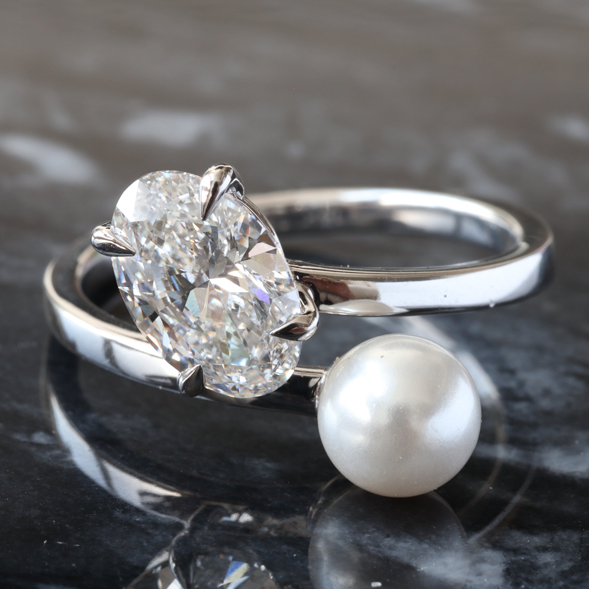 Lab Created 1.51ct Oval Solitaire & Fresh Water Pearl Cross Over Ring.