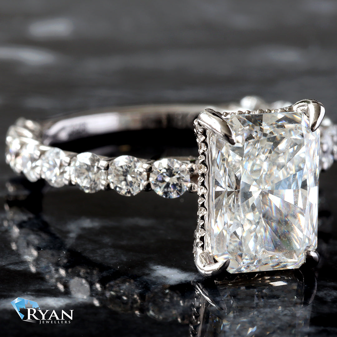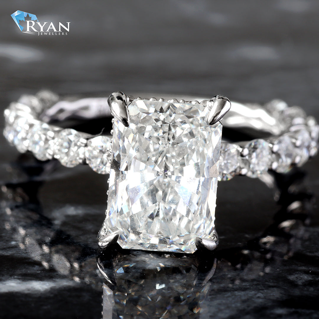Stunning Lab Created Diamond Solitaire ring featuring one 3.01ct Radiant cut solitaire set into a 18kt white gold shared prong set scallop profile mount totalling 1.40ctw carats.