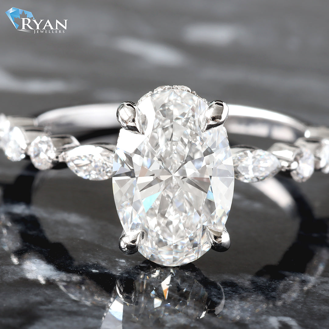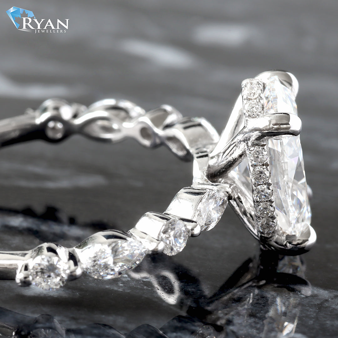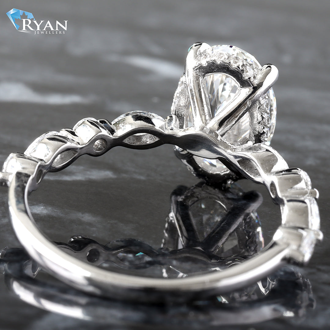 Lab Created Diamond ring featuring one 2.09ct oval cut diamond solitaire set into a 0.10ctw diamond 14kt white gold mount with alternating round and marquise cut diamond shared prong set shoulders & hidden halo