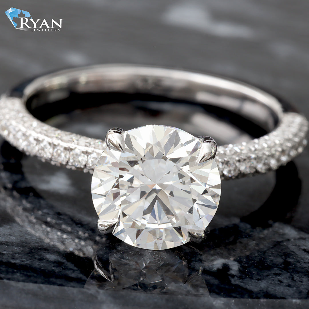 Lab Created Diamond ring featuring one 2.00ct round brilliant cut diamond set into a 0.62ctw 14kt white gold three sided diamond mount with hidden diamond halo