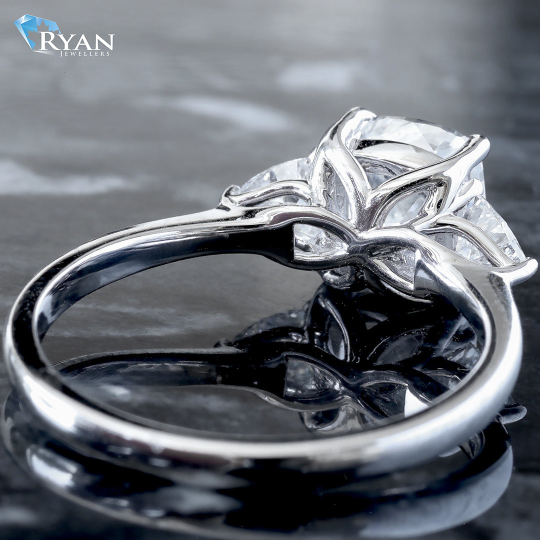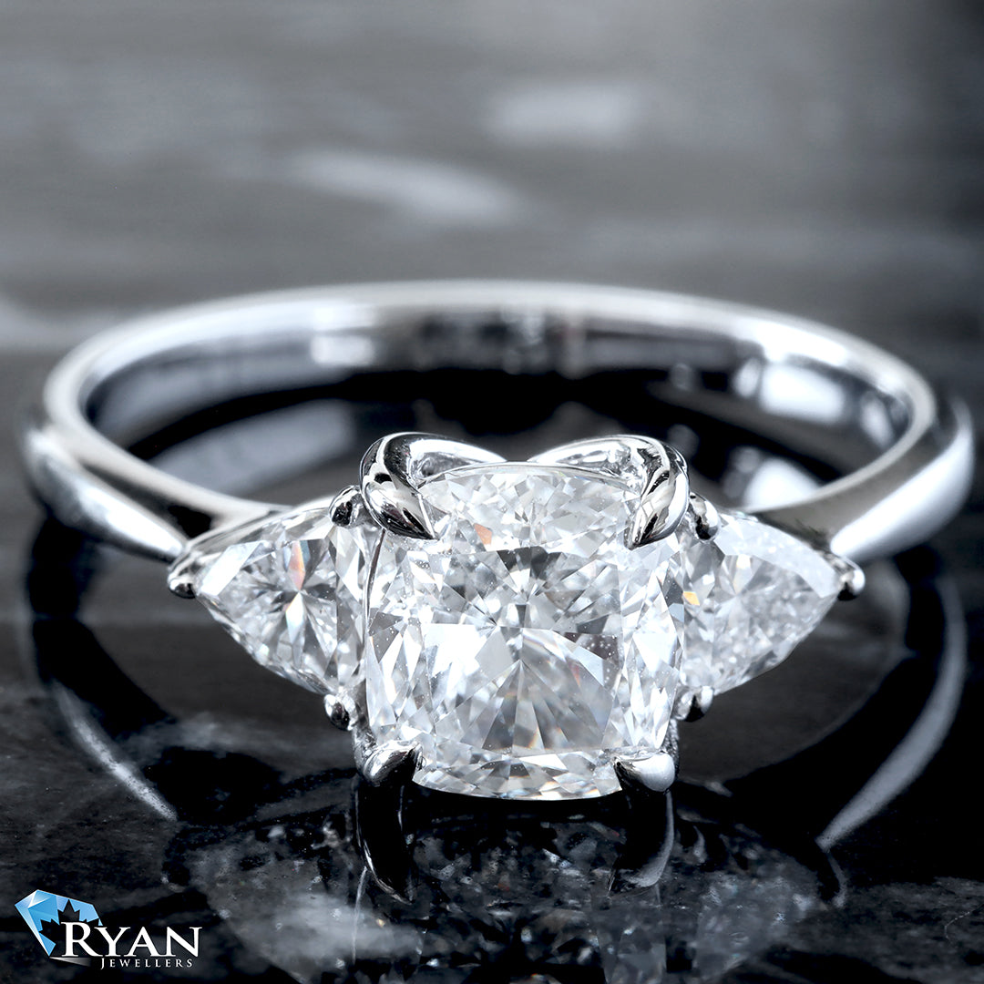 1.50ct Cushion Cut Solitaire with two (2) trillion cut accents, high polished shoulders & butterfly basket.