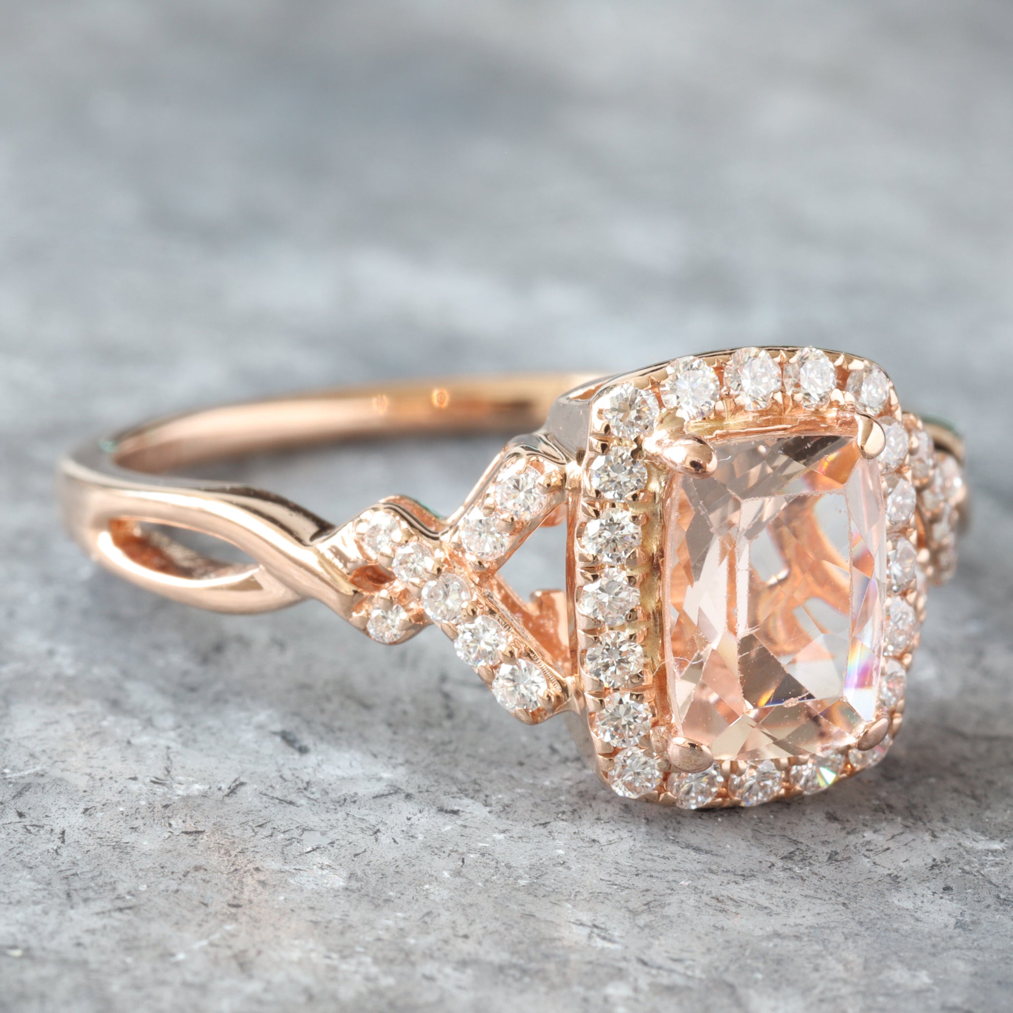 Elongated Cushion Morganite with Diamond Halo and X Pave Shoulders Ring