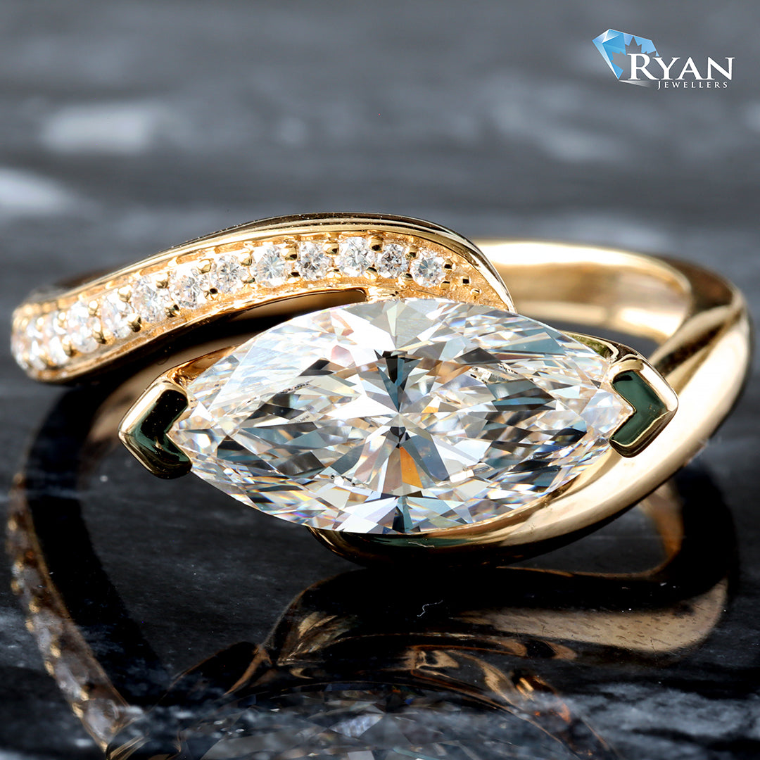 - Created Marquise Solitaire Cut Diamond Center totalling 2.01ct with a east to west set and 0.12ct wave diamond pave yellow gold mount 14kt.