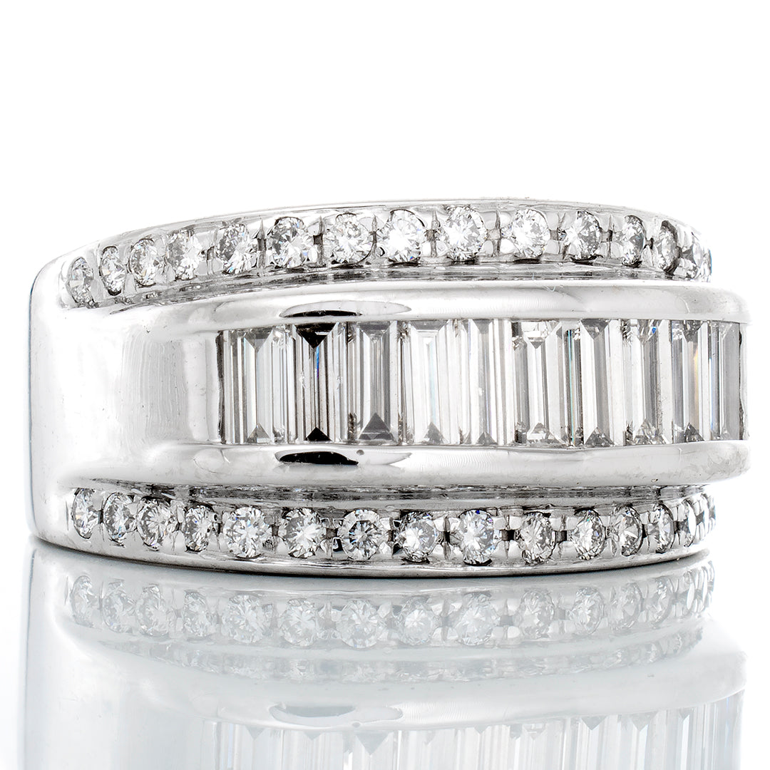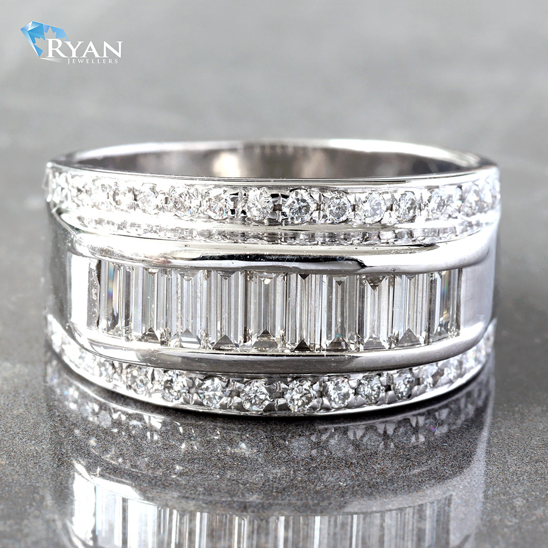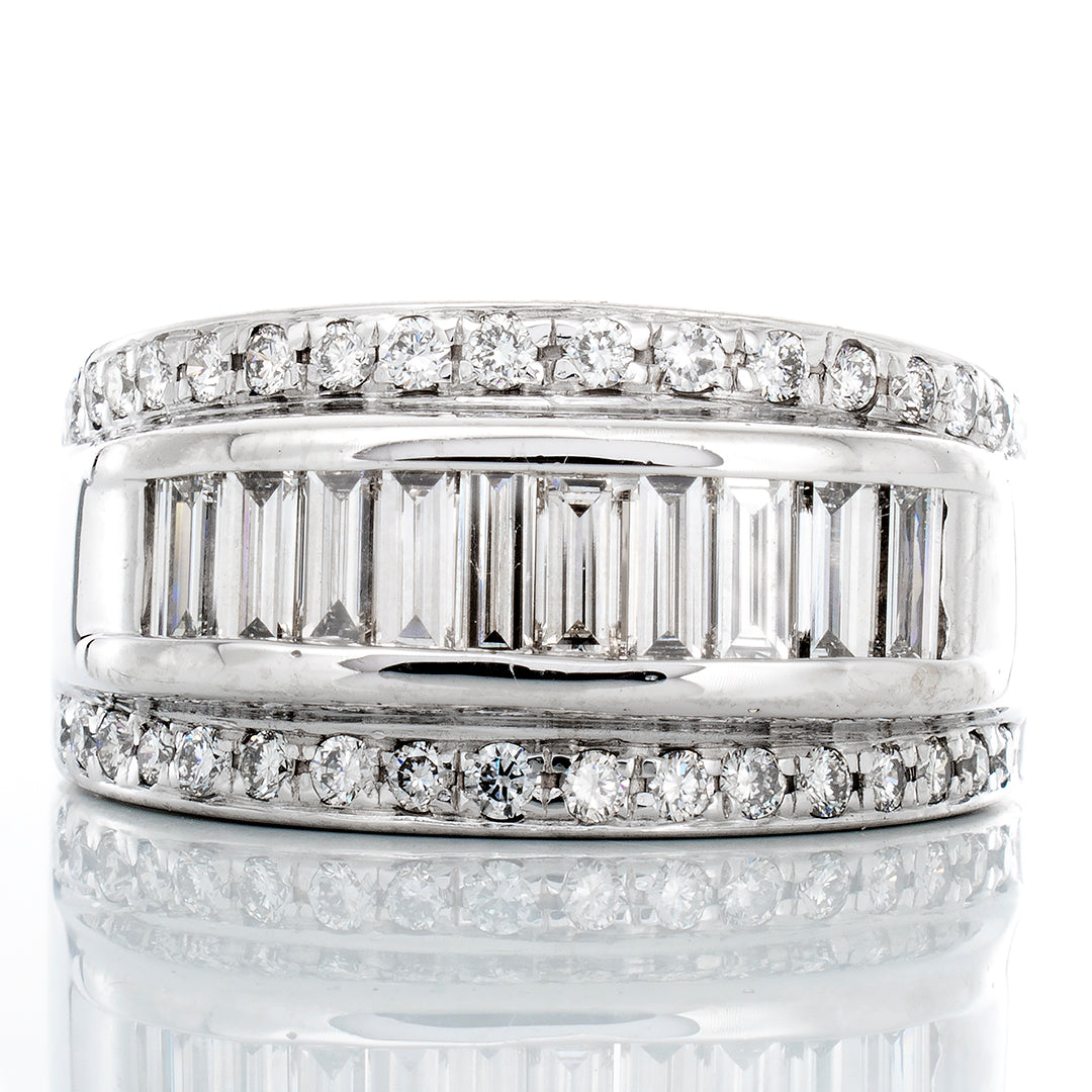 RING GW 14K 1.50CTW THREE ROW DESIGN WITH RAISED CENTER EMERALD CHANNEL AND SHARED PRONG ROUND SIDES