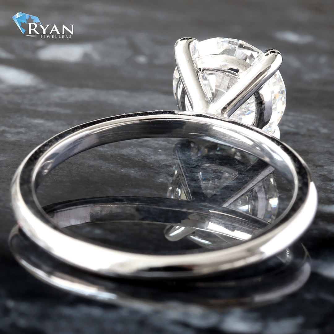 Lab Created Round Diamond Center totaling 2.04ct with a classic high polished White gold mount and open basket.