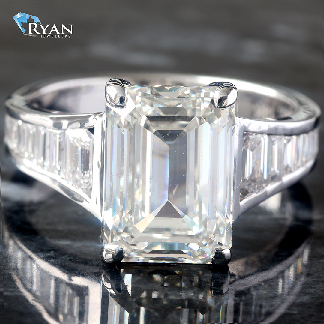 LAB RING GW 14K 7.43CTW EMERALD SOLITAIRE WITH TAPERED BAGUETTE BEZEL SHOULDERS