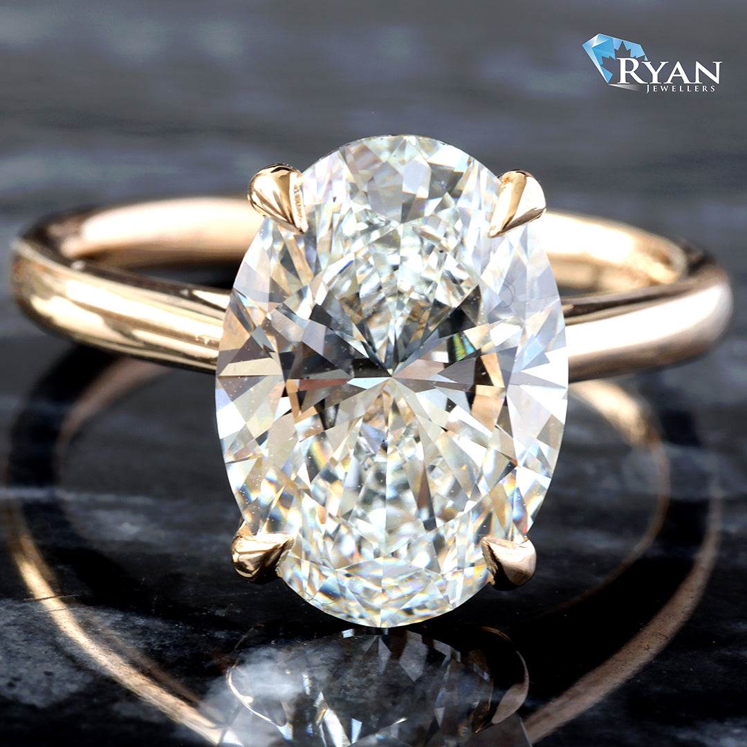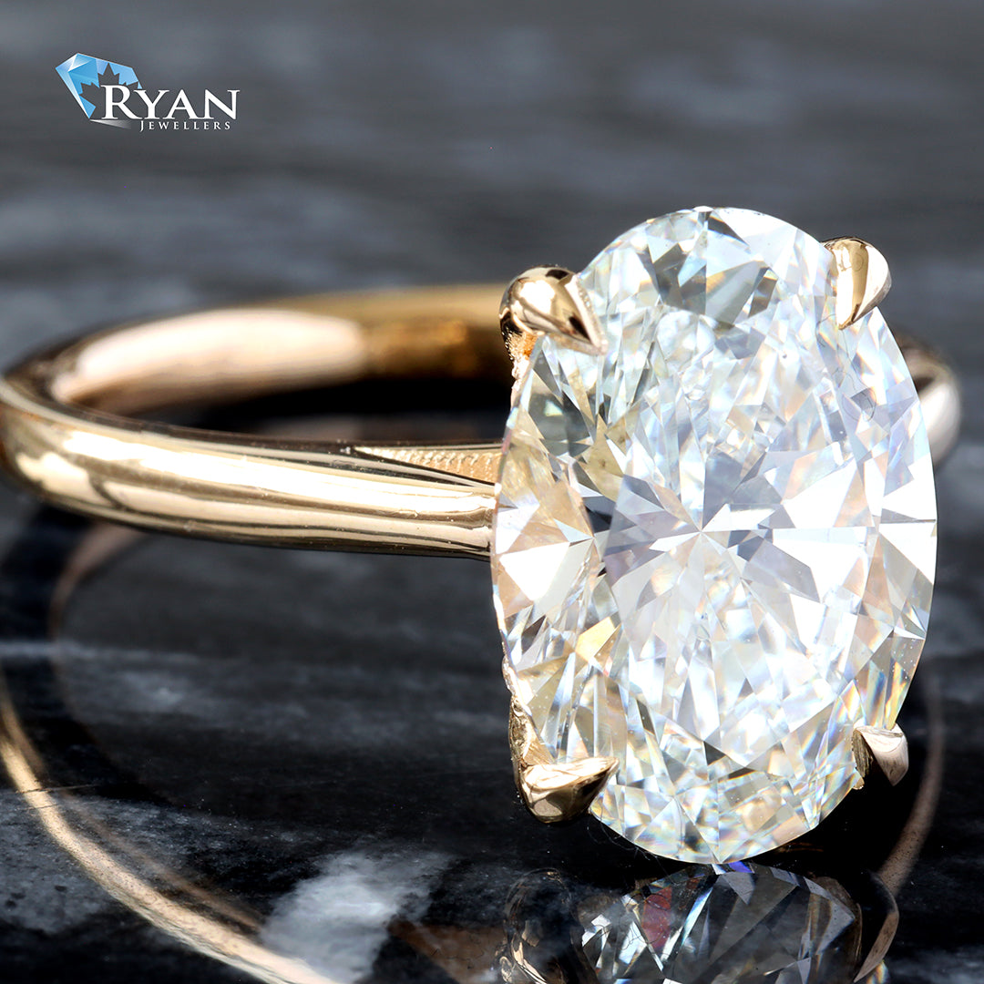 Oval 4.03ct diamond solitaire set in simple 14kt yellow gold mount with hidden 0.13ctw diamond halo.