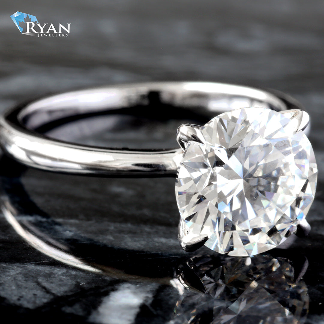 Round brilliant diamond solitaire set in simple 14kt gold four prong setting with eagle talon claws holding beautiful 3.01 carat center stone.