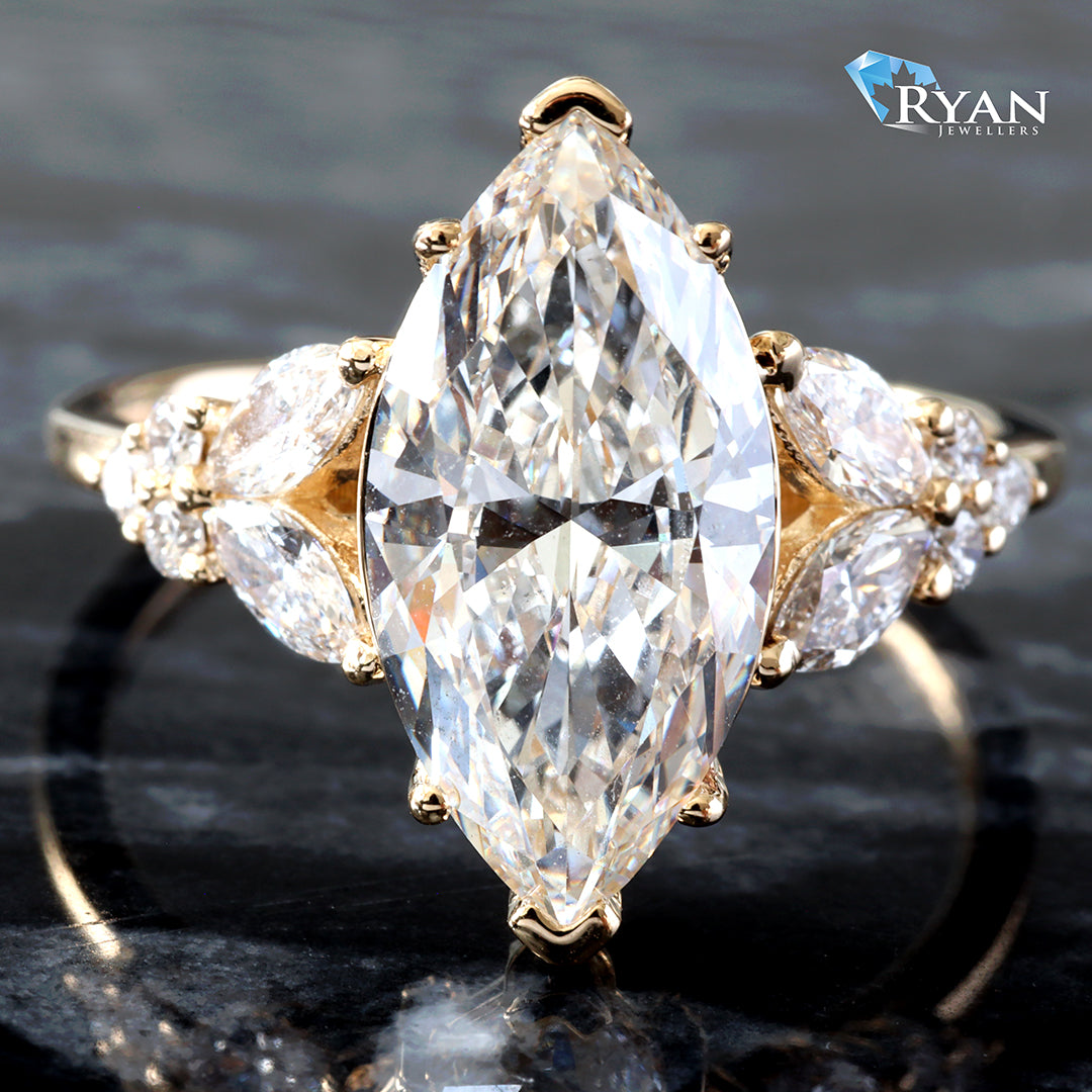 Beautiful lab created Marquise Solitaire with Marquise & Round Floral Shoulders Totalling 3.60 carats.