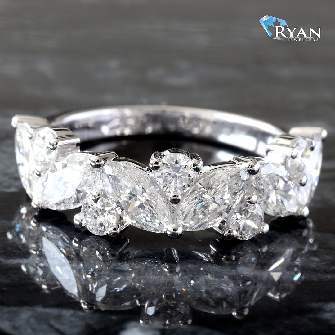 Lab Created round and marquise cut diamonds set with round prongs on flat-edge shank.